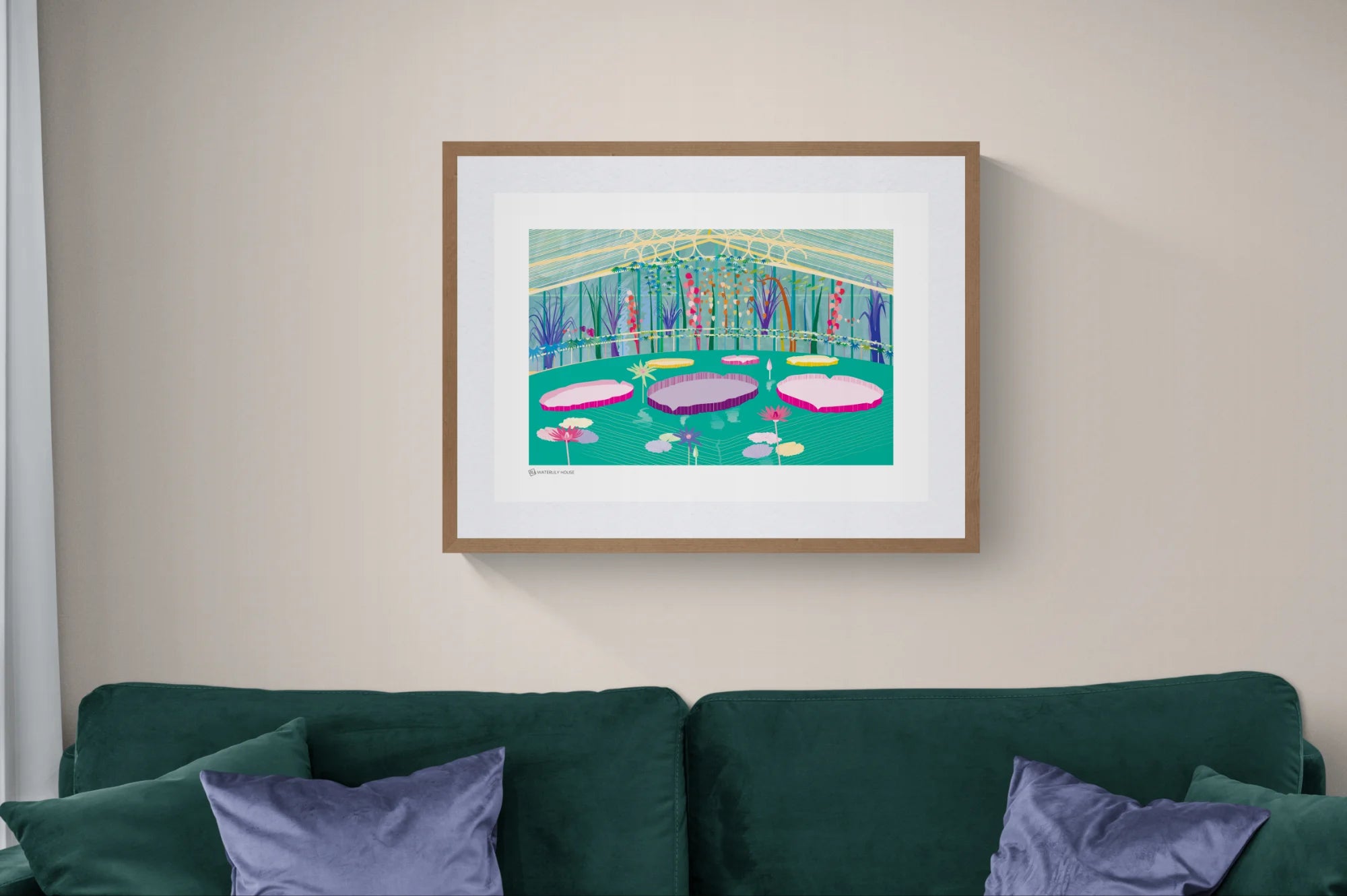 Illustrated in a distinctive, architectural style, water lilies and lily pads fill the pond in an array of vibrant pinks, purples and warm yellows. Plants fill the glasshouse wall, adding depth to the light-filled scene. Add Waterlily House to your art collection for a calming and peaceful space.