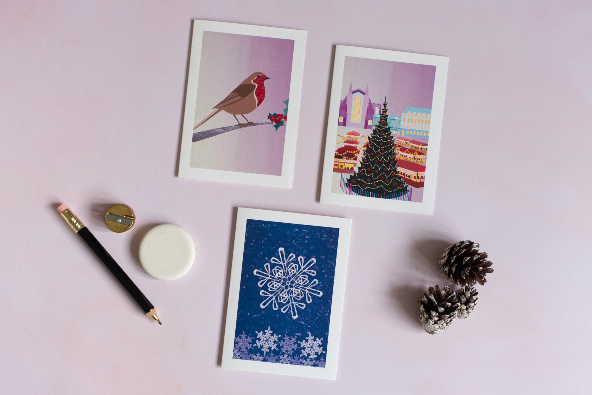 Imagine wandering through a lively town square teeming with both locals and tourists, the air filled with the delightful aroma of Christmas spices, mulled wine and roasting chestnuts. The scene is illuminated by the warm glow of the stalls and the surrounding timeless architecture, all centred around a majestic Christmas tree that reaches towards the sky. Nostalgic colours and iridescent paper combine to create a heartwarming and inviting feeling, perfect for conveying a lovely warmth to your message.